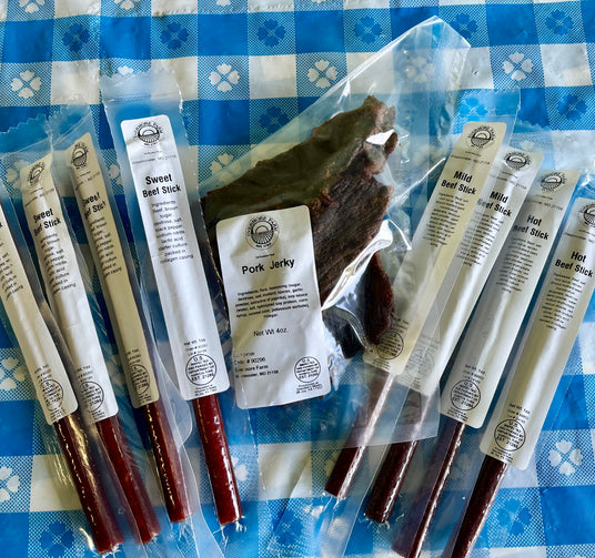 Bet you can't eat just one. Great for school lunches or an easy, tidy take-along for family trips. Eight of our all beef meat sticks, a mix of varieties, and a 4 oz pack of our tasty Ham Jerky. All shelf stable. No refrigeration needed.